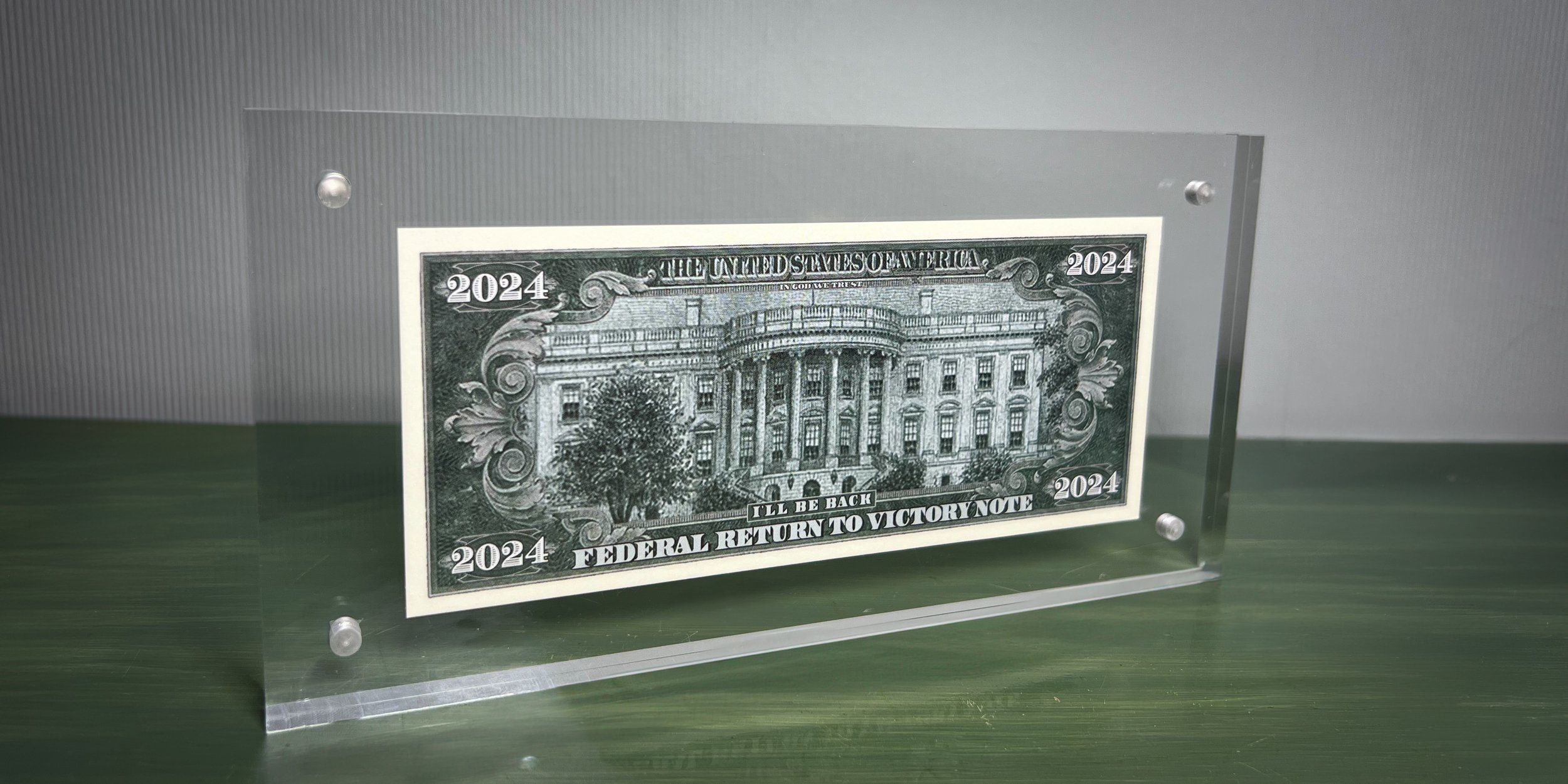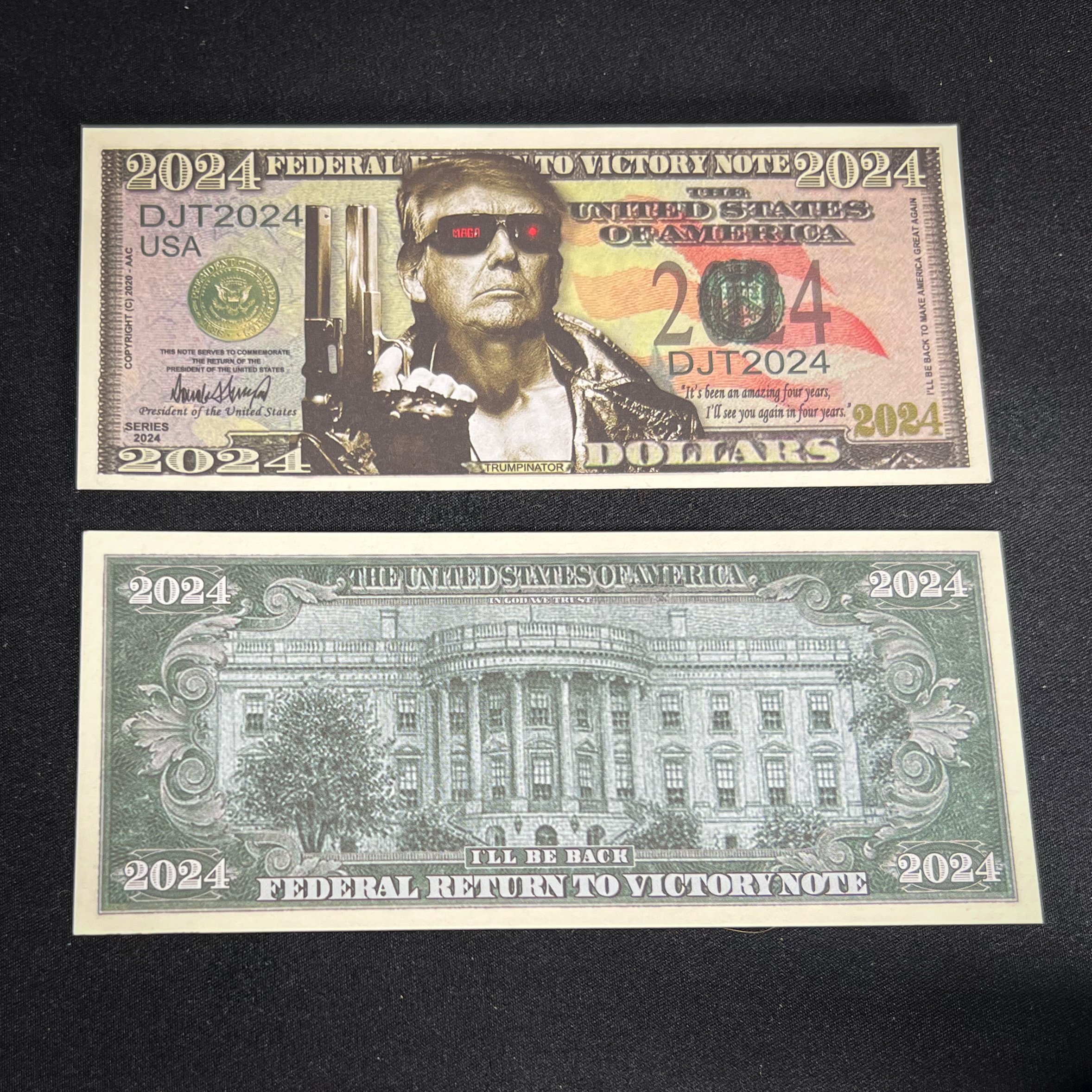 Trump said it himself: “I’ll be back.” He kept that promise. The Termination Note pays tribute to President Trump’s unstoppable return to power and his mission to dismantle the radical agenda once and for all. Featuring the iconic “Trumpinator” design with laser focus, firepower in hand, and the unmistakable MAGA 2024 imprint. This note is more than a collectible, it’s a warning shot to the establishment.